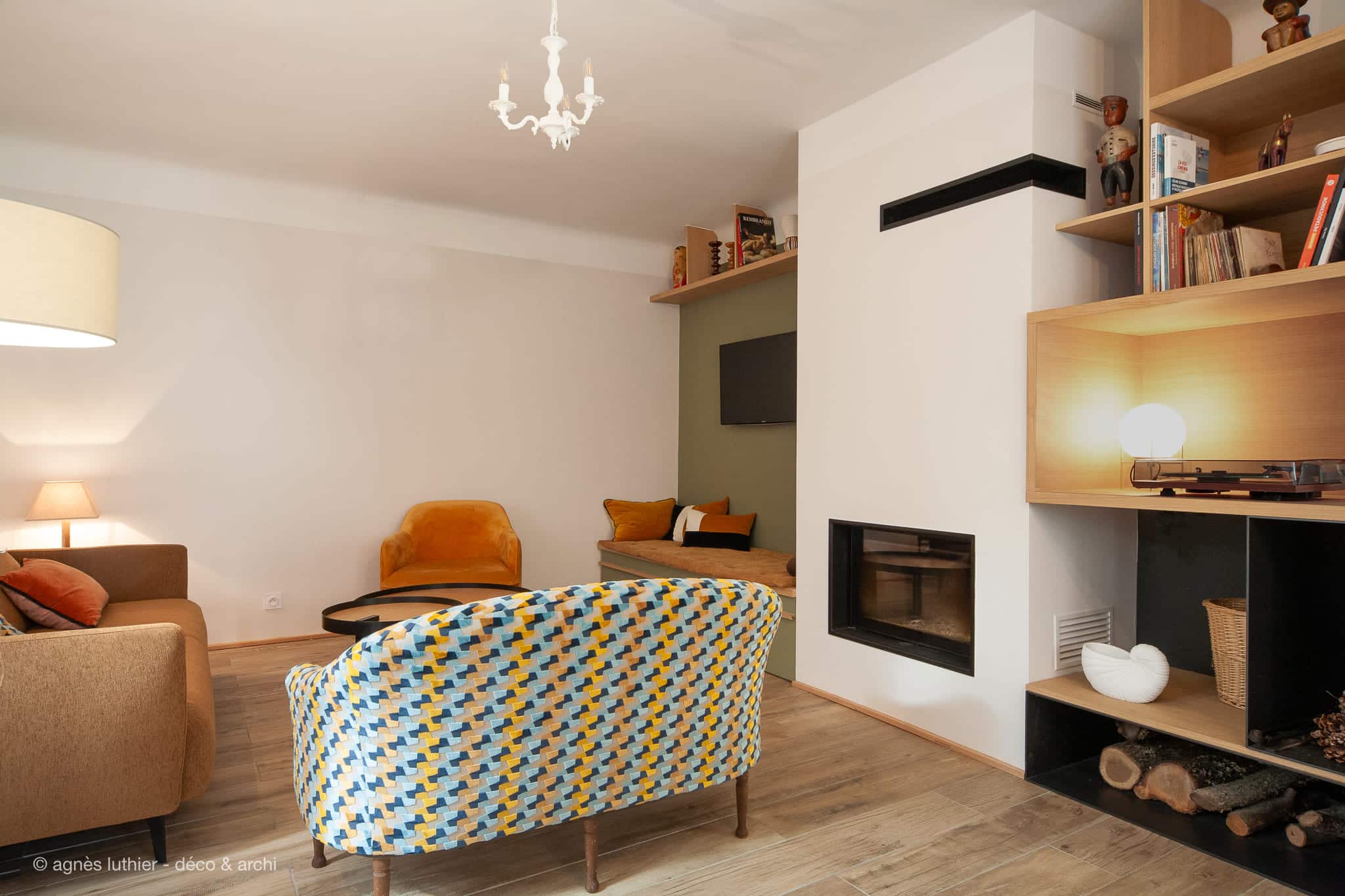 Ensemble sur-mesure agrandissant l'espace en valorisant le décor et paysage environnant.TV cachée, rétro-éclairage pour sublimer les rythmes verticaux, création d'une banquette, coin lecture près de la fenêtre, habillage de la hotte de la cheminée pour intégration...