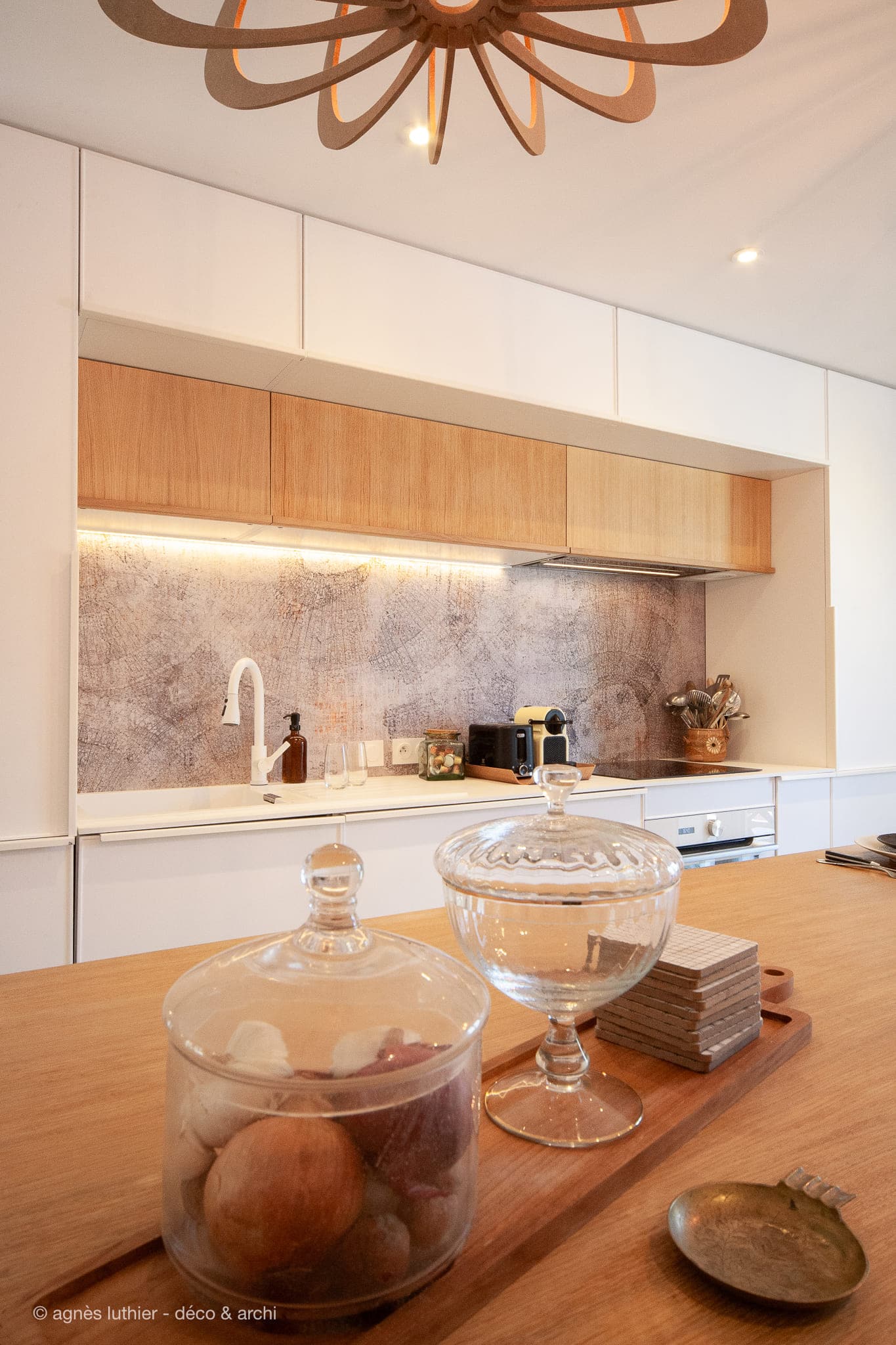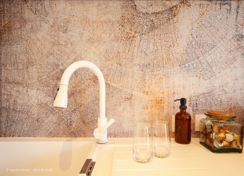 Papiers peints, métal mordoré, jeu de lignes et matières, cuisine personnalisée, meuble-mur aux multiples fonctionnalités: dressing, garde-manger, garde-coprs, et zone technique. Choix de mobilier au formes arrondies et moelleuses.... La suite à venir prochainement !...