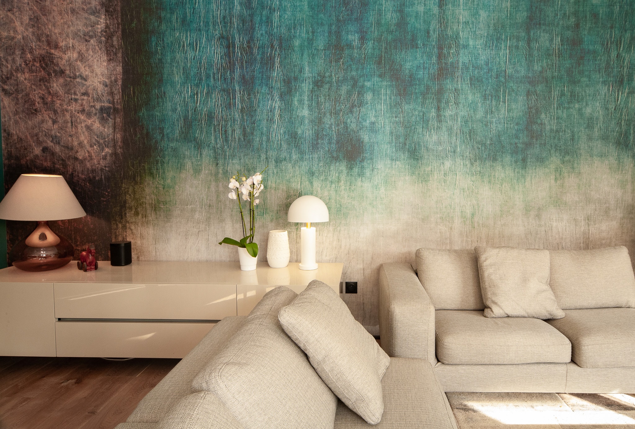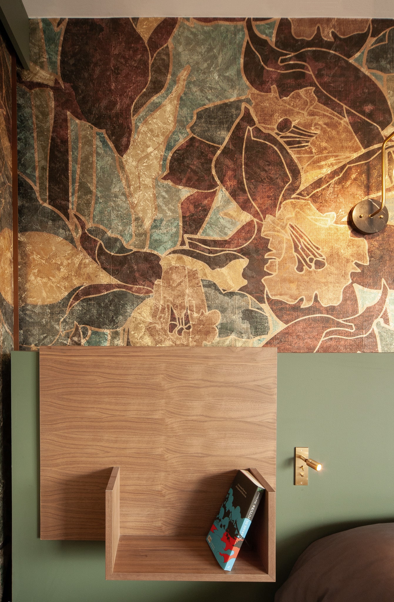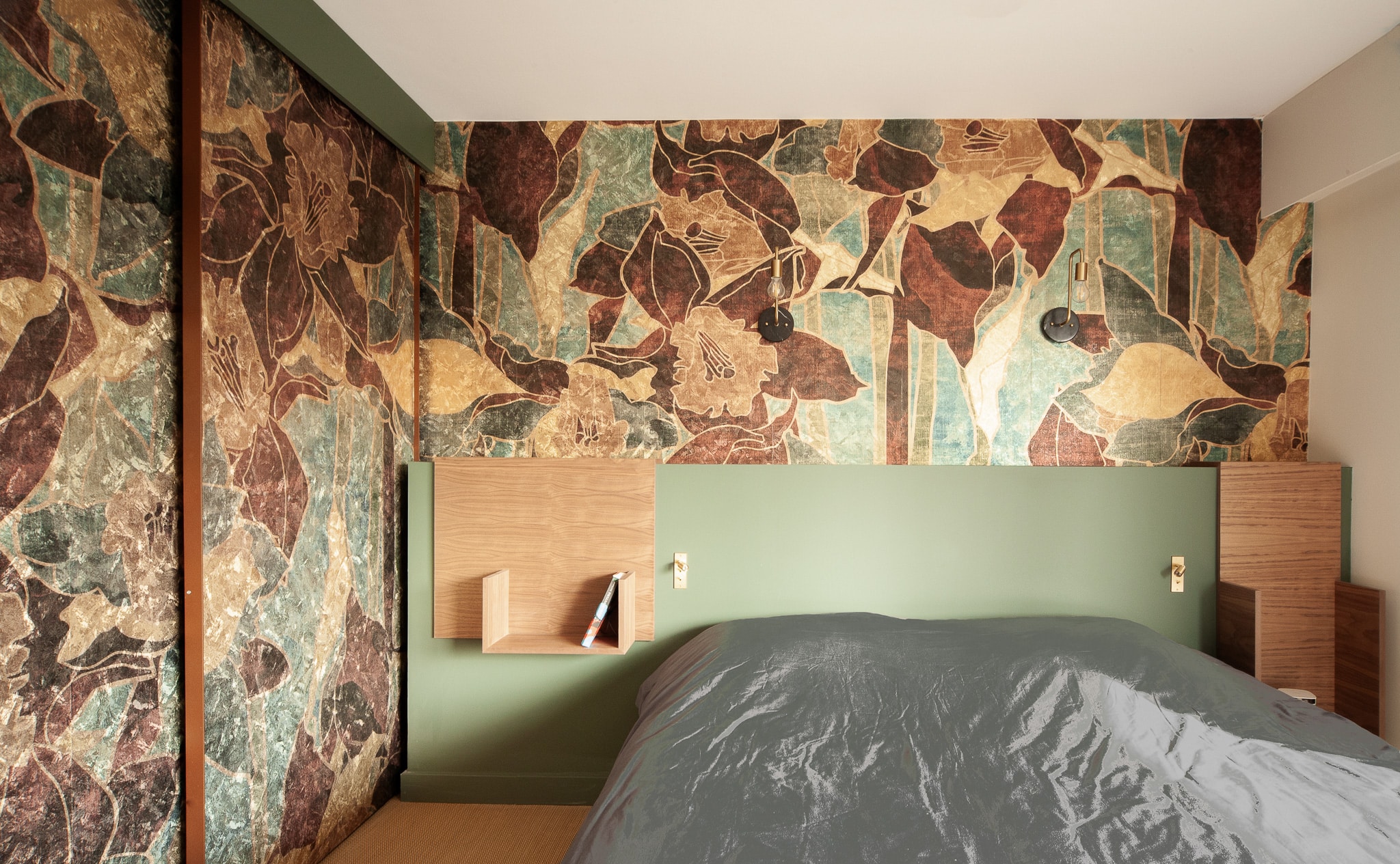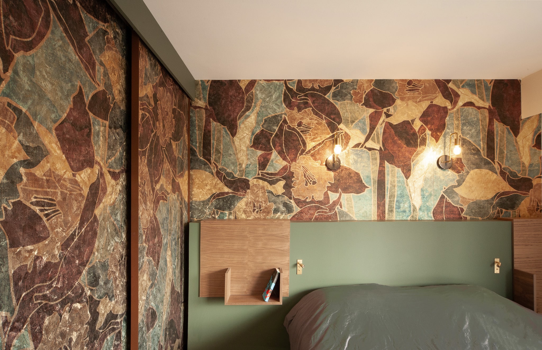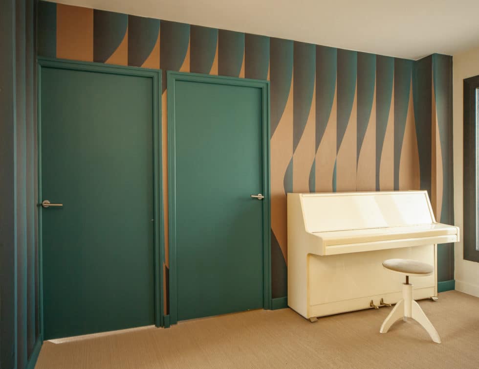 Un ensemble haut en couleurs et matières : papier peint tel un tableau de Rothko dans le salon, papier peint seventies dans le couloir de l’étage pour l’espace piano. Papier encore aux reflets mordorés pour une chambre parentale colorée et osée. Du noyer comme leitmotiv.